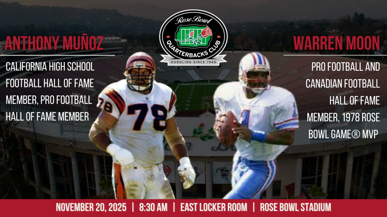 In 2025, the Rose Bowl Quarterbacks Club is proud to host a six-event speaker series at the iconic Rose Bowl Stadium. Events will feature notable guest speakers from the world of football, including former players, coaches, analysts, and community leaders, who will share insights, stories, and inspiration.